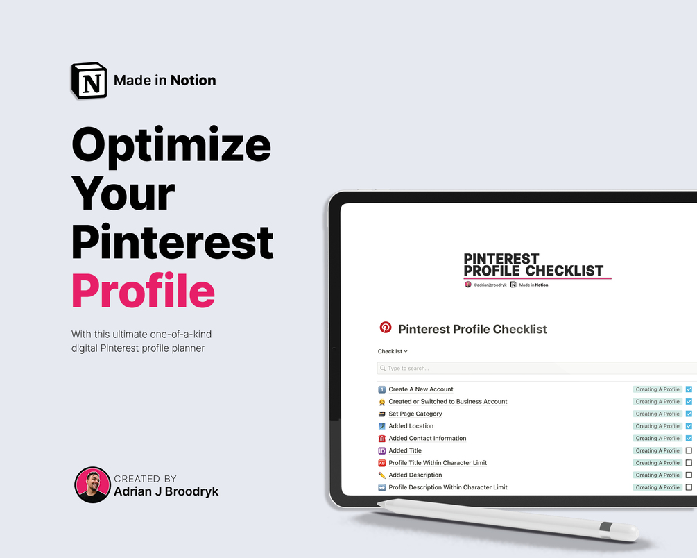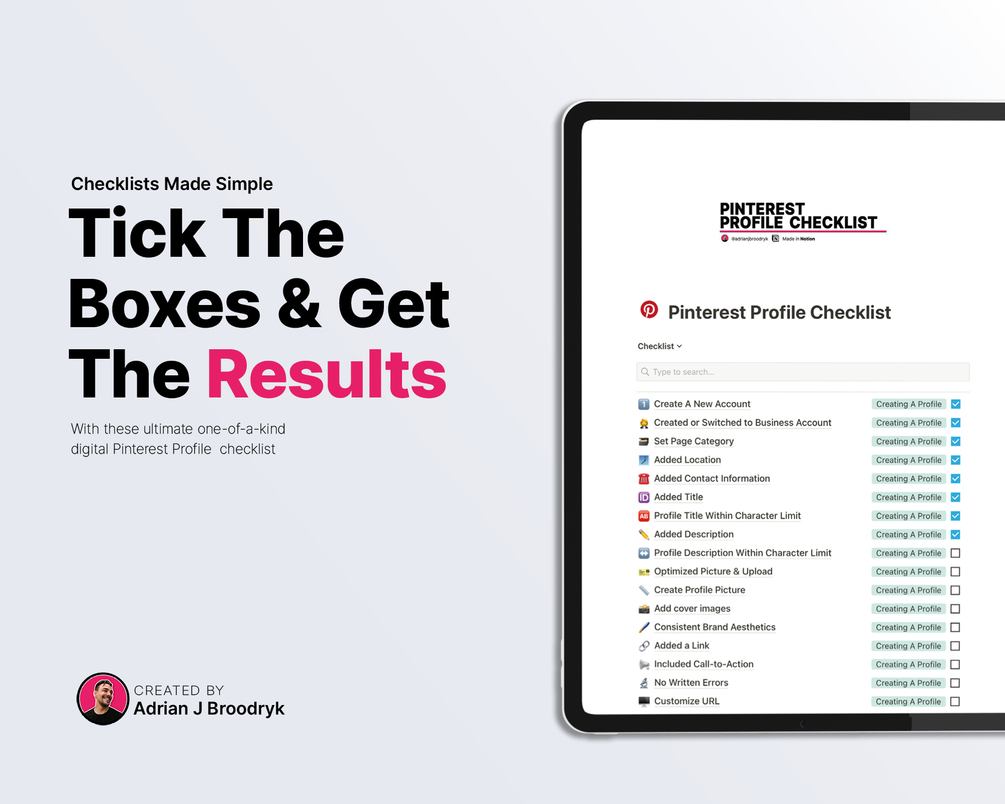 With Our Digital Pinterest Profile Checklist - Made in Notion by Adrian J Broodryk
