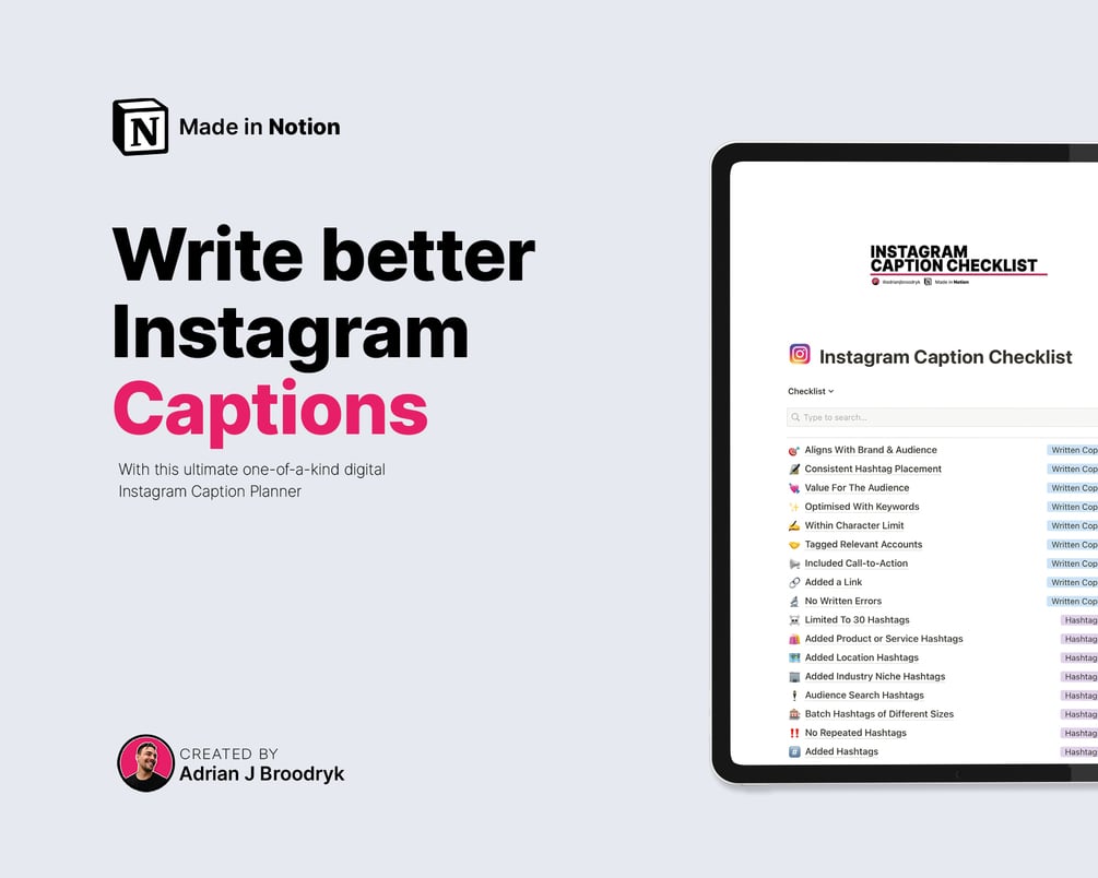 With Our Digital Instagram Caption Checklist - Made in Notion by Adrian J Broodryk