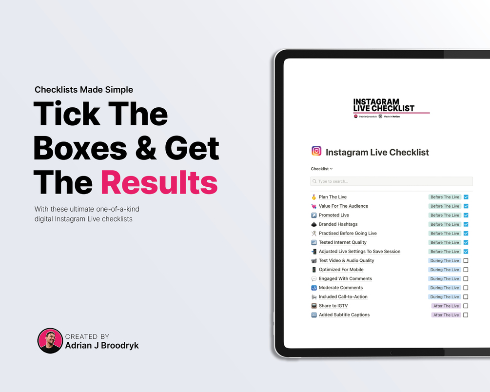 With Our Digital Instagram Live Checklist - Made in Notion by Adrian J Broodryk